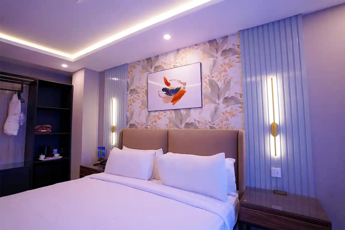 The bathroom is a highlight of the hotel rooms for rent. Our deluxe room is finished in white marble and equipped with modern amenities and toiletries, giving you a spotless, hygienic experience. You can also use self‑care products, a hair dryer, a sink, and a full‑size mirror so you can get ready for the day.